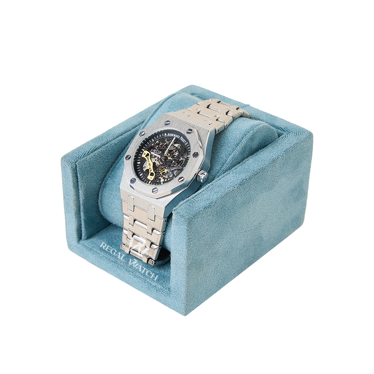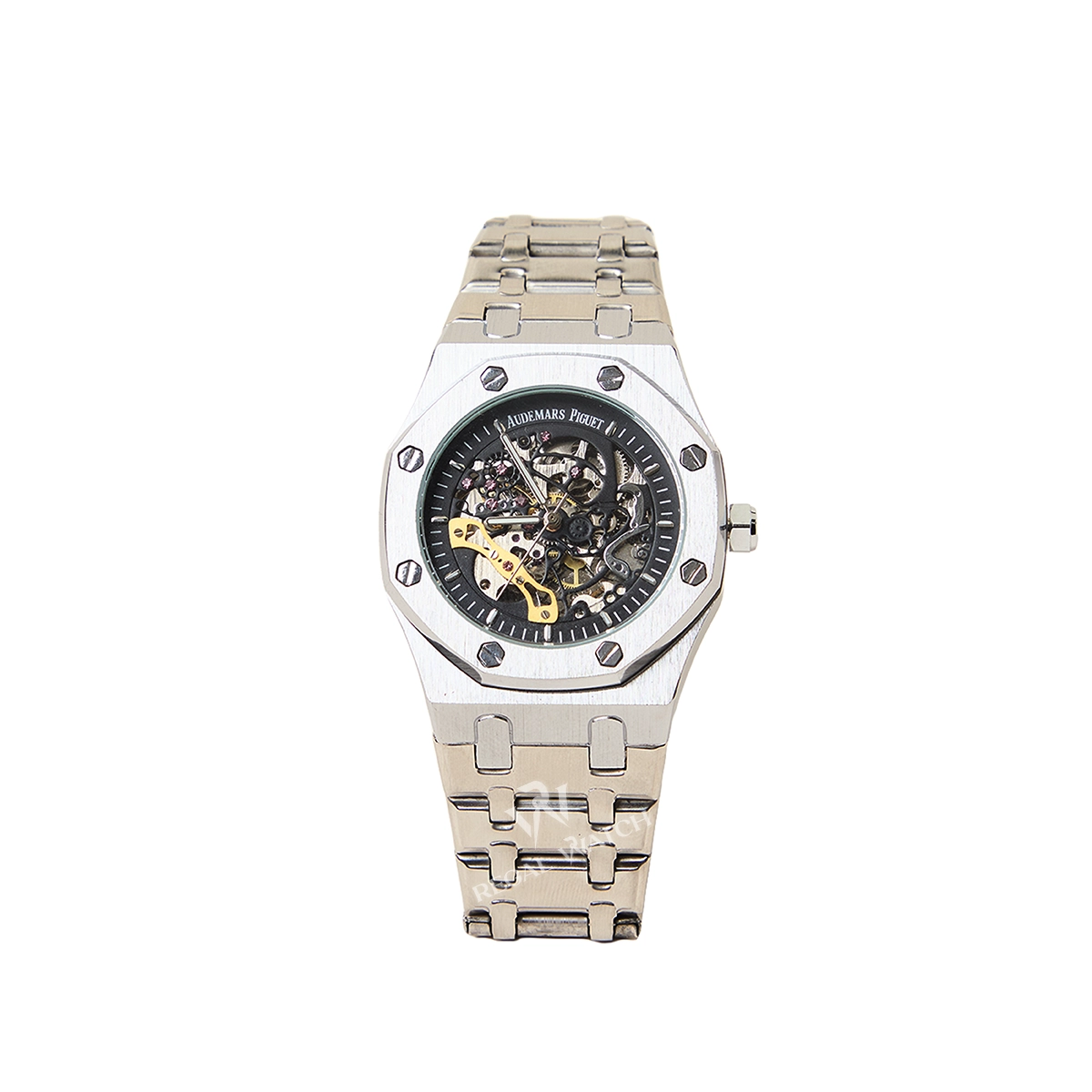 This automatic skeleton watch brings a bold, royal octagon design with a fully open dial that showcases the moving mechanical parts inside. The 42 mm stainless steel case has a strong presence, while the brushed bracelet gives it a clean, modern finish.